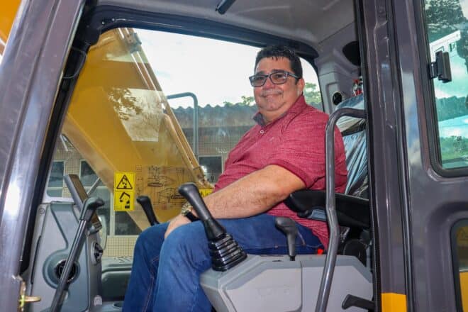 Acompanhado pelo secretário de Obras -Josué Elias, pelo secretário de Agricultura – Mário Jorge e pelo vereador Careca Gadelha, o gestor celebrou a conquista de uma escavadeira hidráulica que reforçará os serviços de infraestrutura e manutenção de ramais no município.