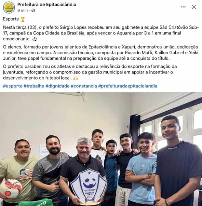O prefeito Sérgio Lopes utilizou suas redes sociais nesta quarta-feira (3) para celebrar a conquista do título da Copa Cidade de Brasiléia 2025 pela equipe sub-17 do São Cristóvão. Em publicação, o gestor elogiou a vitória contra o Aquarela e enalteceu o talento dos jovens atletas do município.