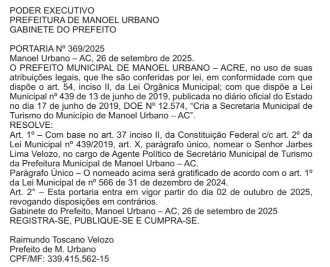 O prefeito de Manoel Urbano, Toscano Veloso (PP), promoveu uma reformulação no alto escalão de sua gestão com a exoneração do filho Jarbes Lima Velozo do cargo de chefe de gabinete e sua posterior nomeação para a Secretaria Municipal de Turismo. As mudanças foram publicadas no Diário Oficial do Estado desta segunda-feira (29) e têm efeito imediato.