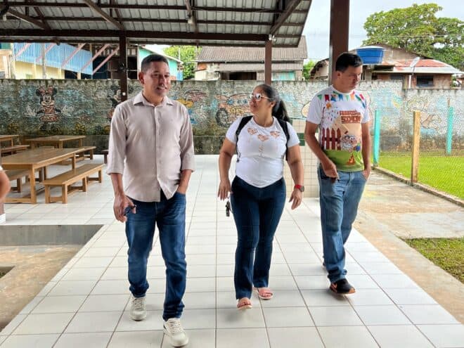 O prefeito Jerry Correia, acompanhado da secretária de Educação Vanderléia e do gestor Gesse Bandeira, visitou nesta terça-feira a Escola Simon Bolívar para conferir de perto o andamento das obras de manutenção e adequação do espaço escolar.