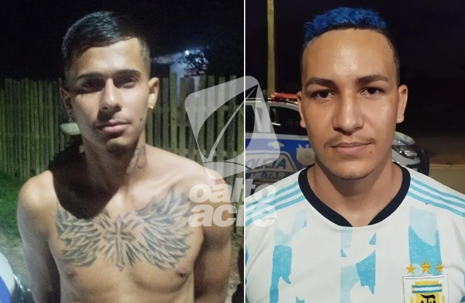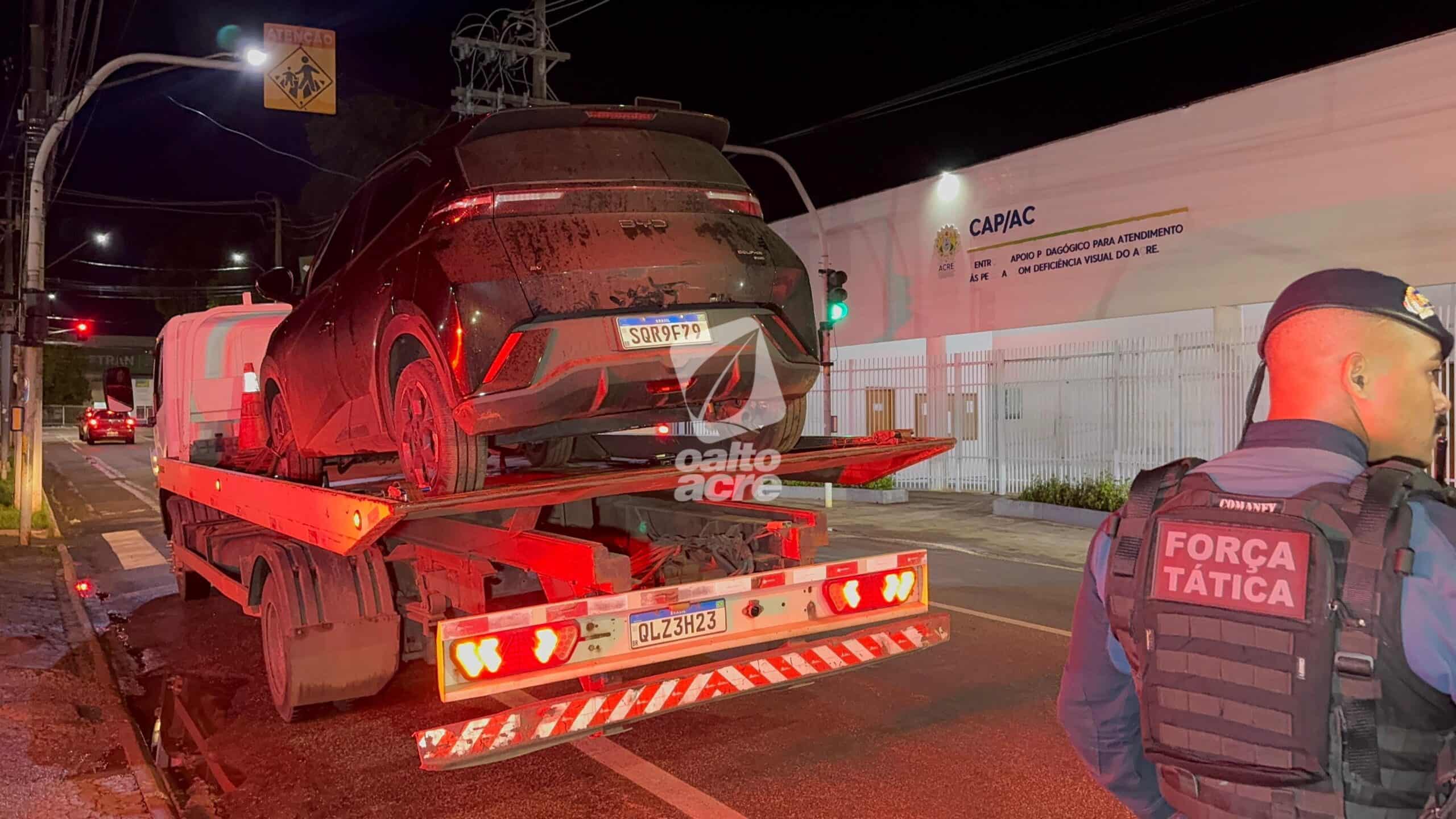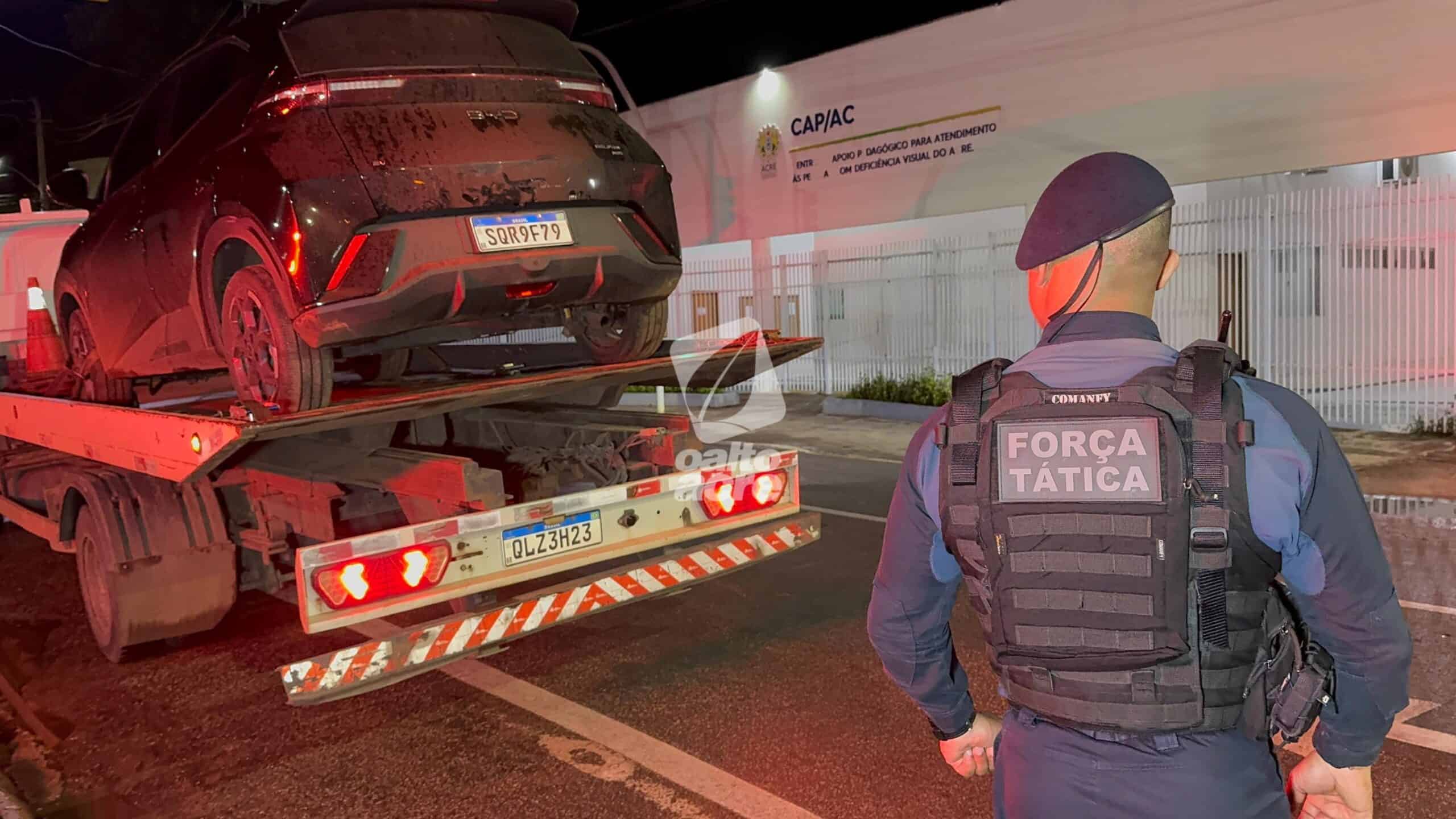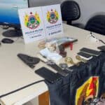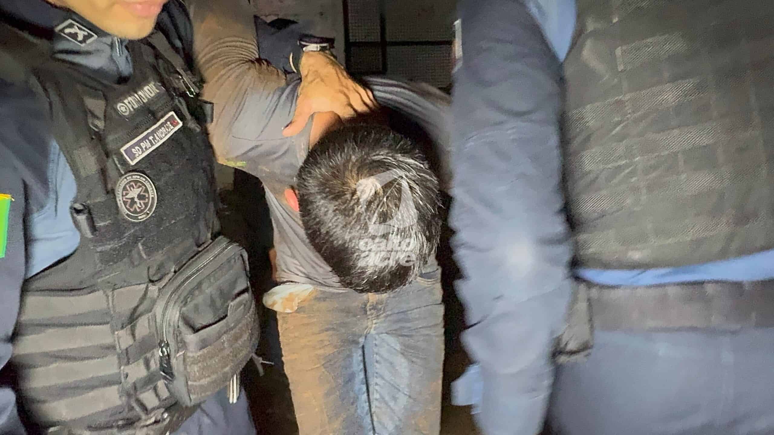 Durante patrulhamento na região do Parque Industrial, os policiais localizaram o carro. Ao perceber a aproximação da viatura, o condutor realizou manobras perigosas e, em seguida, os ocupantes abandonaram o veículo e tentaram fugir a pé para uma área de mata. Ambos foram alcançados, rendidos e algemados.