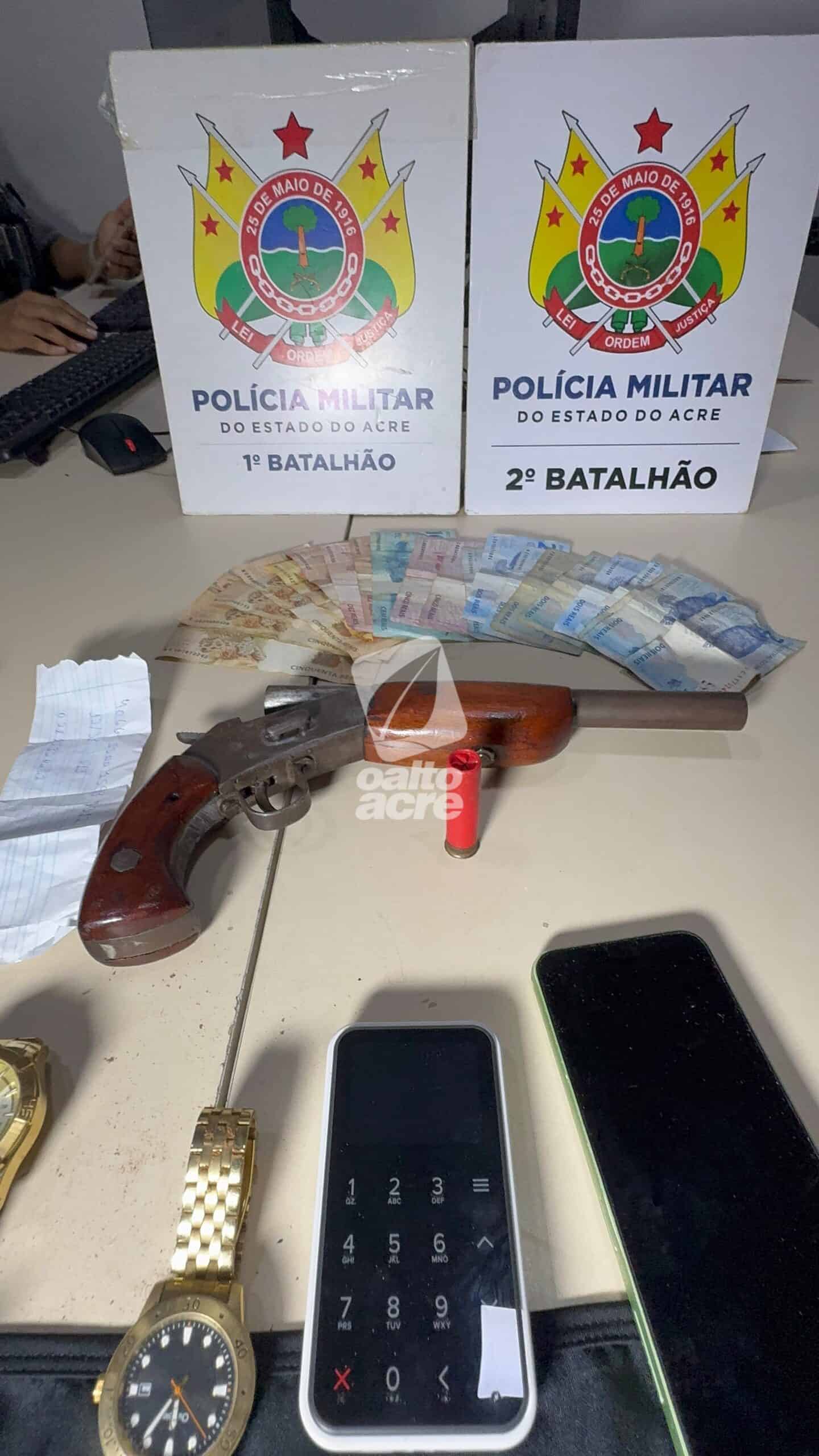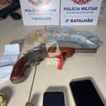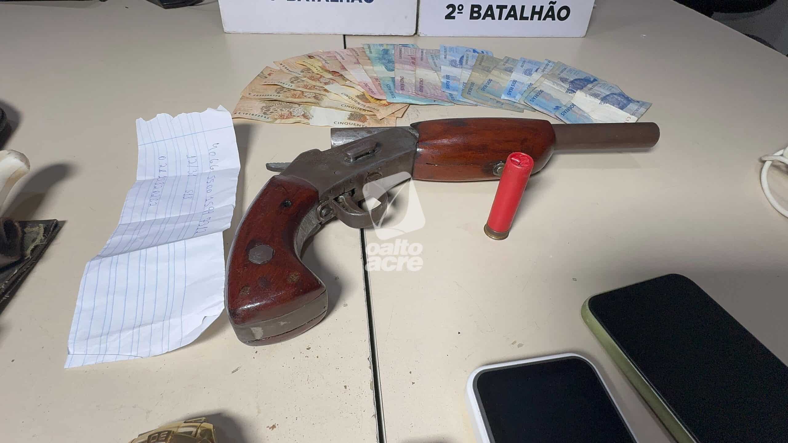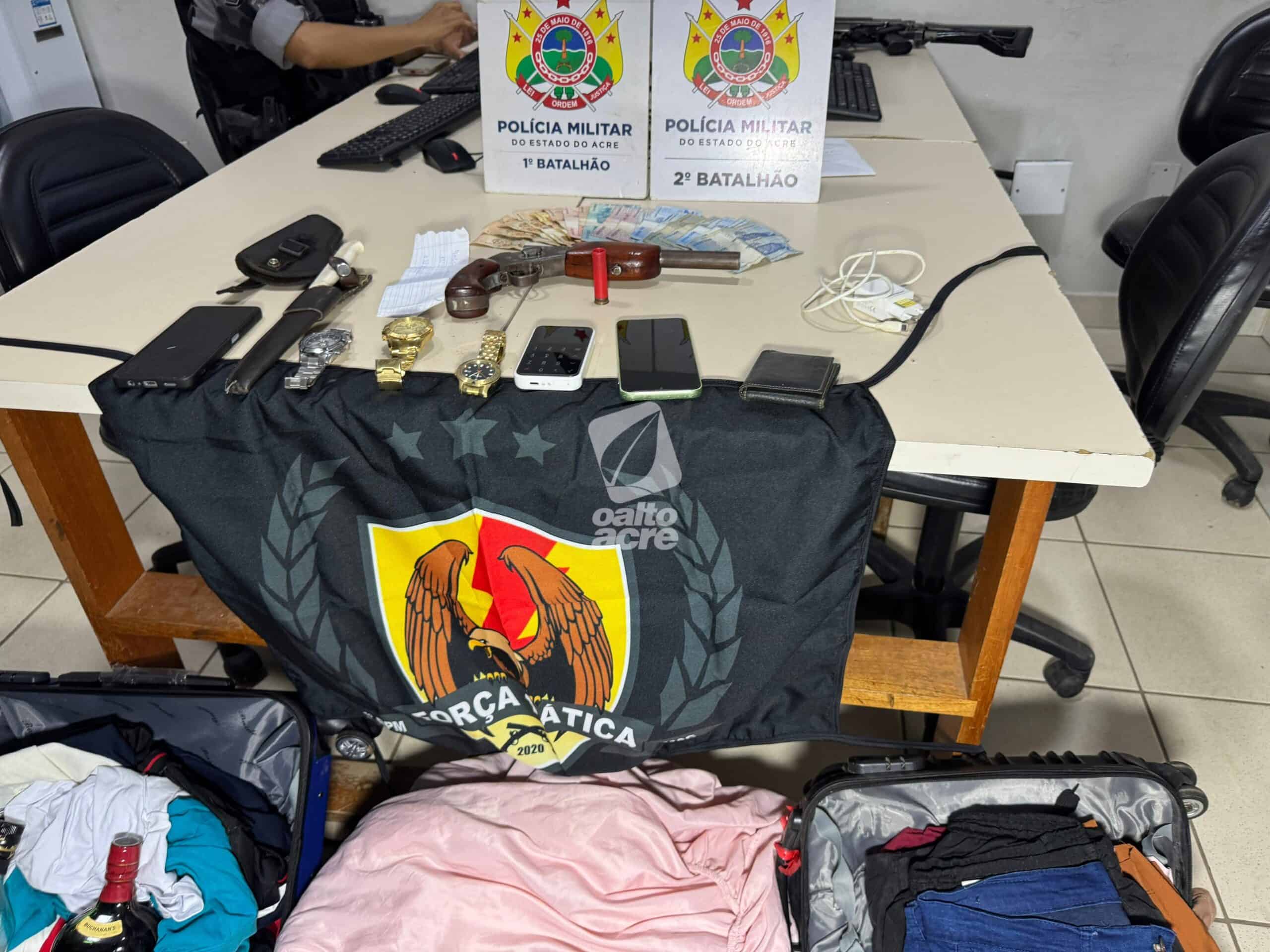 Na abordagem, os suspeitos confessaram o crime e informaram que os objetos roubados estavam no porta-malas e que havia uma arma escondida sob o banco do passageiro. No local, foi apreendida uma escopeta calibre 28, com munição intacta, além dos pertences da vítima.