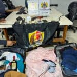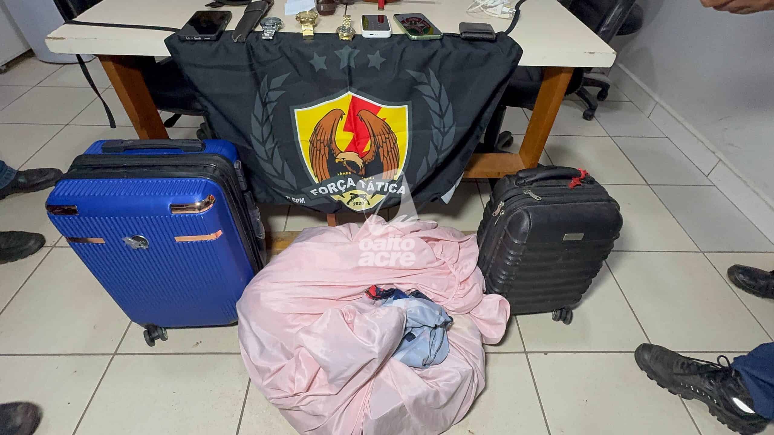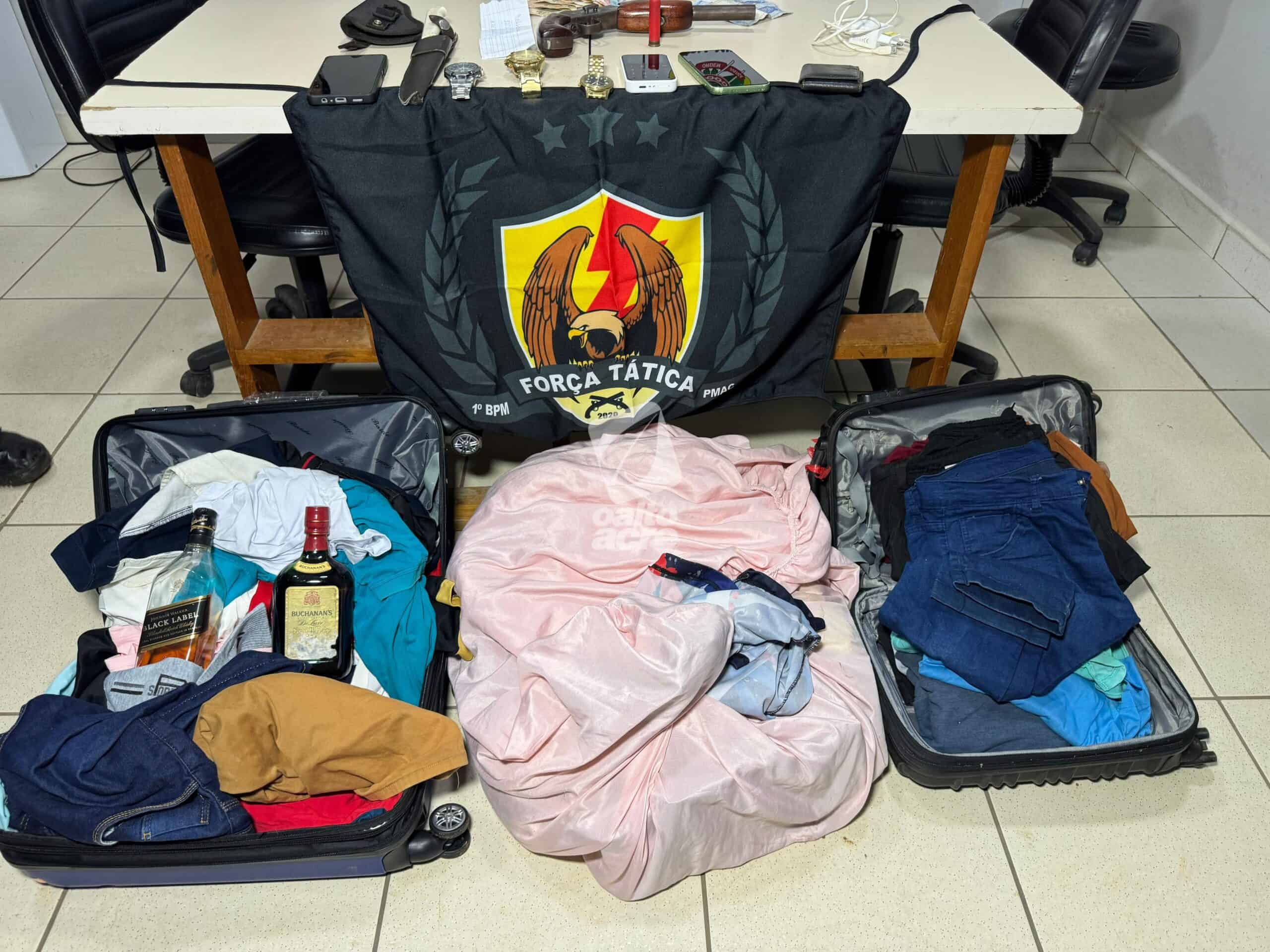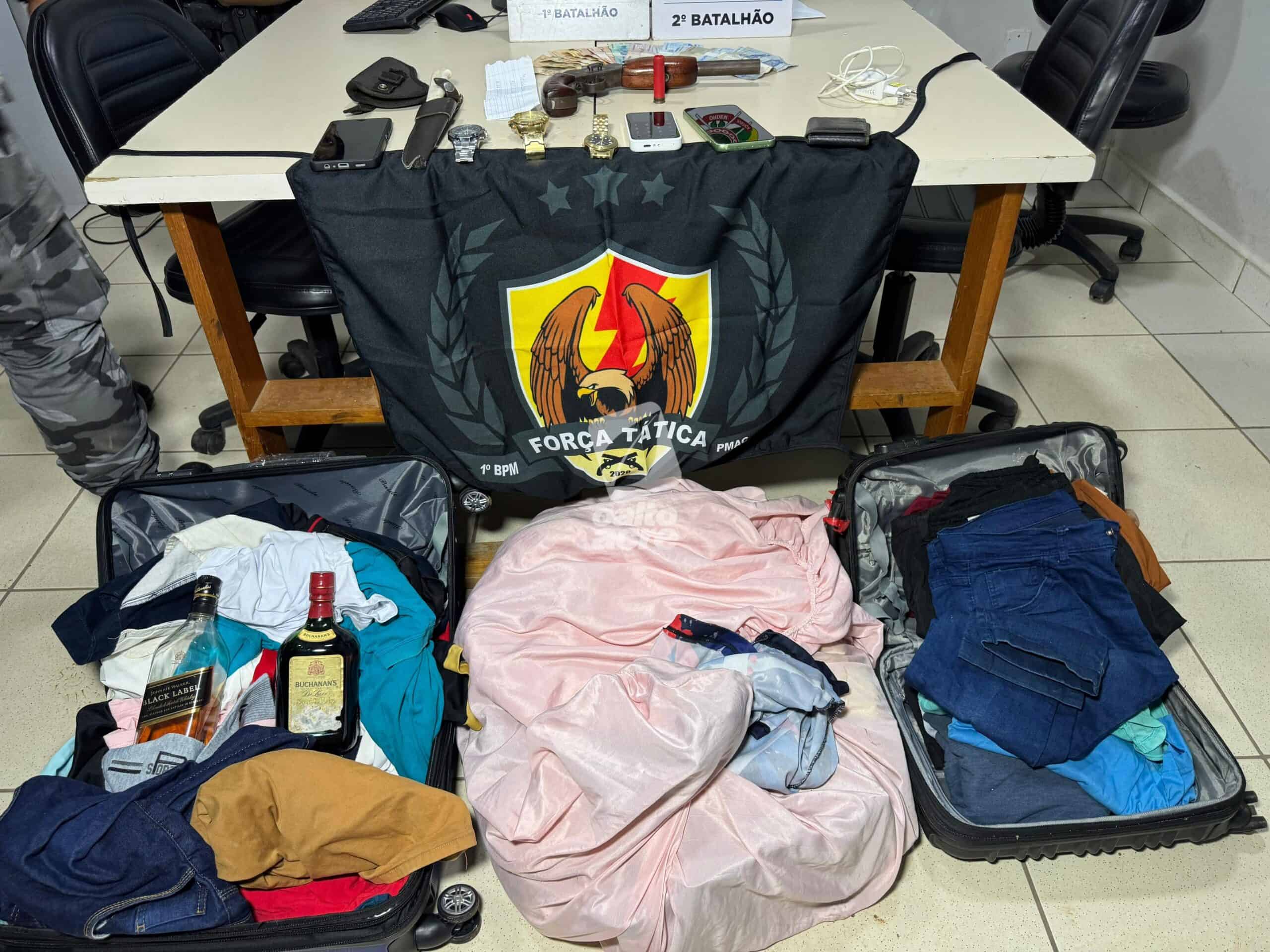 Na abordagem, os suspeitos confessaram o crime e informaram que os objetos roubados estavam no porta-malas e que havia uma arma escondida sob o banco do passageiro. No local, foi apreendida uma escopeta calibre 28, com munição intacta, além dos pertences da vítima.