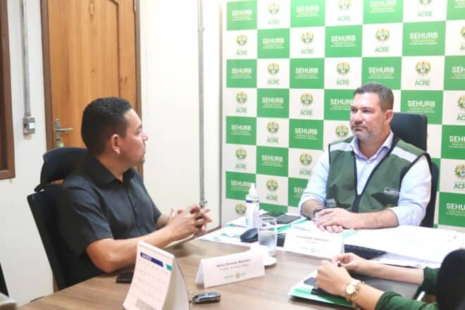 Nesta segunda-feira, 16, o prefeito Jerry Correia esteve em Rio Branco, onde iniciou sua agenda com uma visita à Secretaria de Estado de Habitação e Urbanismo (SEHURB). Na ocasião, foi recebido pelo secretário de Estado, Egleuson Santiago, para tratar do andamento das obras habitacionais destinadas ao município de Assis Brasil.