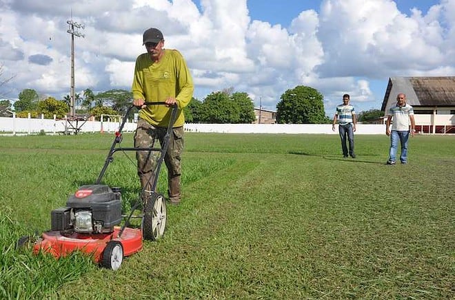 O município com recursos próprios adquiriu uma máquina para fazer a manutenção do gramado
