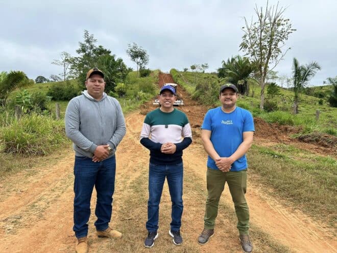 O prefeito esteve acompanhado do presidente da Câmara, vereador Wendell Marques, e do vereador Gilson Boiadeiro, além de moradores da comunidade que acompanharam de perto os serviços. Foto: cedida