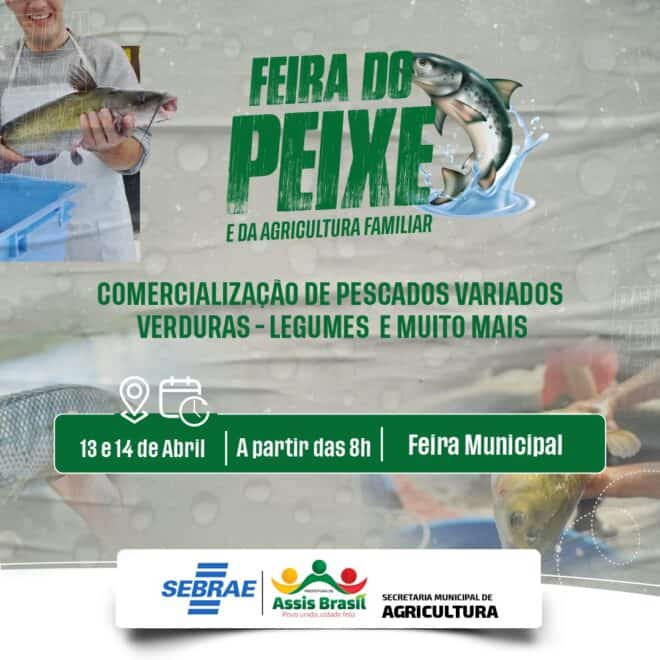 Nesta quarta e quinta-feira, 13 e 14 de abril, a Prefeitura de Assis Brasil, por meio da Secretaria Municipal de Agricultura e em parceria com o SEBRAE, vai realizar a Feira do Peixe 2022. O evento promete abastecer a cidade com pescado durante os principais dias da Semana Santa.