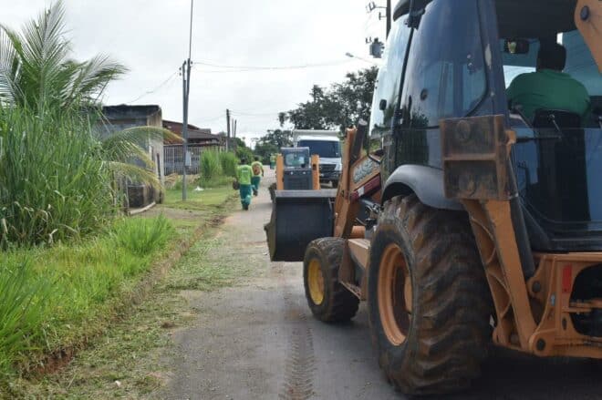 A equipe que trabalha diretamente na limpeza das ruas está nesta segunda-feira (21), retirando entulhos, levando serviço de roçagem, realizando limpeza das ruas e recolhimento de lixo no bairro.