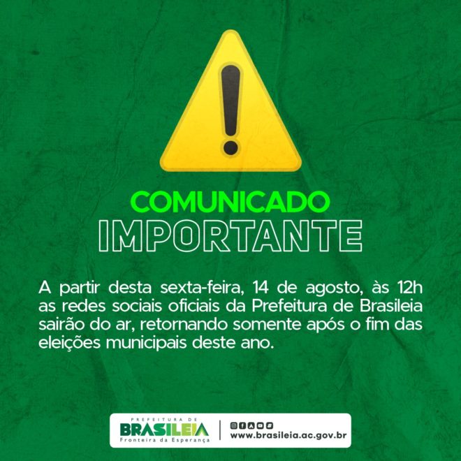 Visando atender as medidas da legislação eleitoral, a Prefeitura de Brasileia irá retirar do ar, a partir do dia 14 de agosto, todas as redes sociais e site oficial da gestão. A administração continuará realizando seus trabalhos porém toda e qualquer noticia e divulgação dos mesmos não estarão sendo publicados no site oficial e nas redes sociais.