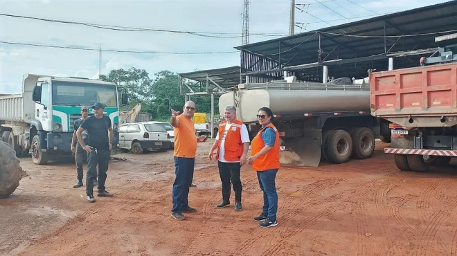 O prefeito Sérgio Lopes acompanhado do Secretária Hiamar Pinheiro, receberam do Governo do estado uma caçamba, um caminhão pipa e um trator tipo Bob-kat para a limpeza das ruas após o nível do rio Acre Baixar.