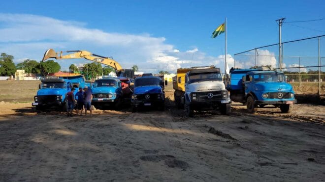 Desde segunda-feira (5), o trabalho segue intenso no estacionamento da Base, onde em decorrência da cheia do rio, ficou concentrada uma grande quantidade de arei a, inclusive na quadra do bairro.