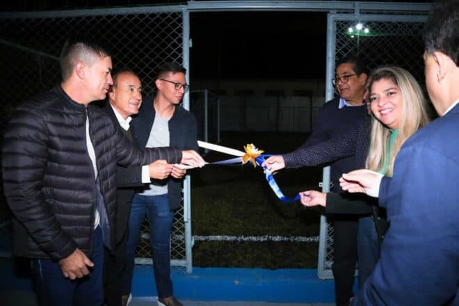 A reinauguração da quadra de grama sintética do Tangará contou com as presenças do prefeito de Rio Branco Tião Bocalom, secretários, vereadores, diretores e a comunidade do bairro.
