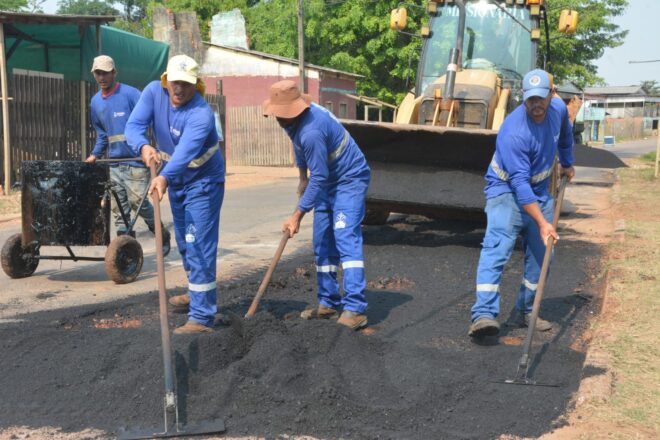 A Prefeitura de Rio Branco, por meio da Empresa Municipal de Urbanização (Emurb), está intensificando os serviços de pavimentação asfáltica nas principais vias da cidade. Nesta terça-feira (13) a equipe liderada pelo encarregado Sidney Azevêdo realiza a obra de tapa-buraco com remendo profundo na Rua Baguari, localizada no bairro Taquari. O trabalho faz parte de um projeto de revitalização que prevê a aplicação de uma nova camada asfáltica por toda a extensão da rua.