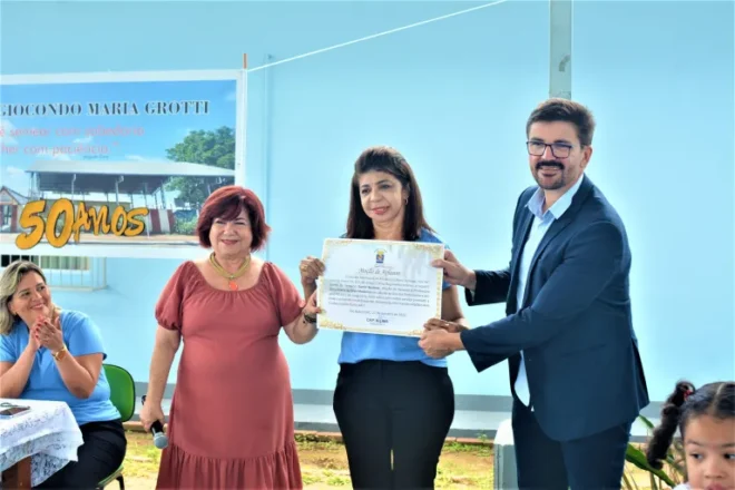 “Fizemos uma comemoração com as crianças, com pais, funcionários, convidamos funcionários antigos para fazer a entrega da placa de 50 anos de menção da Escola Dom Giocondo”, disse a diretora da escola, Érica Santos.