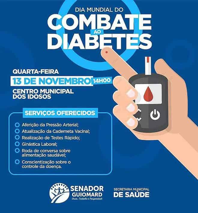 Nesta quarta, 13 de novembro, começa a campanha “combate mundial ao diabetes”. Venha realizar sua consulta e verificar seu estado de saúde, será no Centro Municipal dos Idosos, as 14 horas.