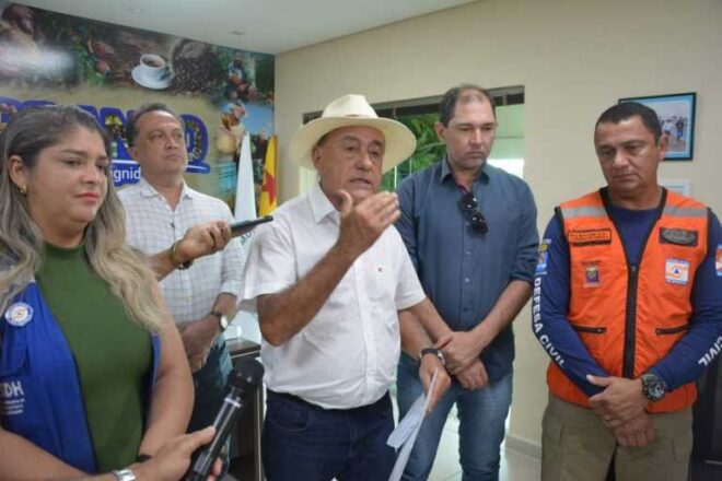 O prefeito de Rio Branco Tião Bocalom, em entrevista coletiva de imprensa nesta segunda-feira (11), prestou contas sobre a distribuição de cestas básicas e atendimento às famílias atingidas pela cheia do Rio Acre. O prefeito reuniu todo o secretariado para definir as novas ações a serem tomadas no atendimento a todos que passam por esse momento de pós alagação.