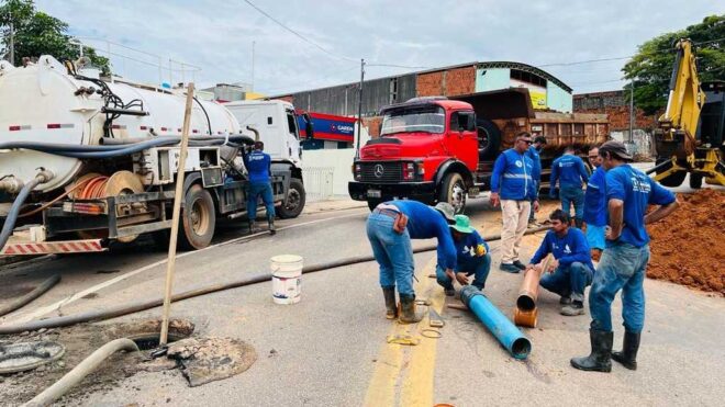 A Prefeitura de Rio Branco, por meio do Serviço de Água e Esgoto de Rio Branco (Saerb), desobstruiu a rede de esgoto localizada na rua Marechal Deodoro, no bairro José Augusto.