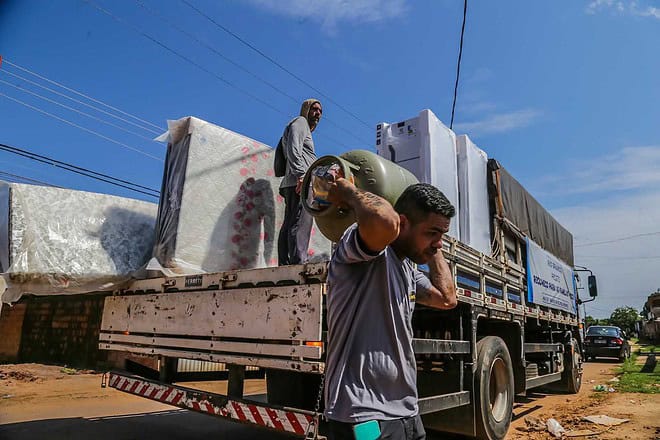 A beneficiada Gedália Ferreira foi uma das primeiras. Ela conta que perdeu quase tudo para as águas da enchente e que ainda não tinha conseguido repor seus móveis que agora chegam para ela e sua família.