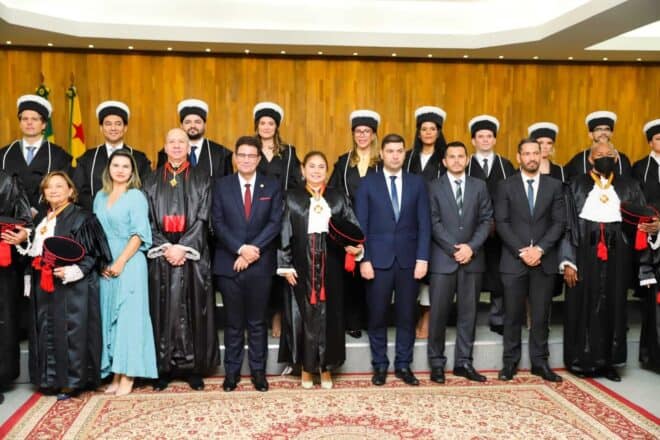 Ao lado do governador Gladson Cameli e da presidente do Tribunal de Justiça do Acre, Waldirene Cordeiro, o presidente da Assembléia Legislativa, Nicolau Júnior, prestigiou na manhã desta quinta-feira (8), a posse dos 15 novos juízes que passam a compor a magistratura acreana.