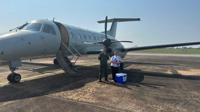 Ele posto uma foto que mostra uma profissional da Fundhacre ao lado de um piloto e um avião da Força Aérea Brasileira , no que parece ser o desembarque no órgão doado.