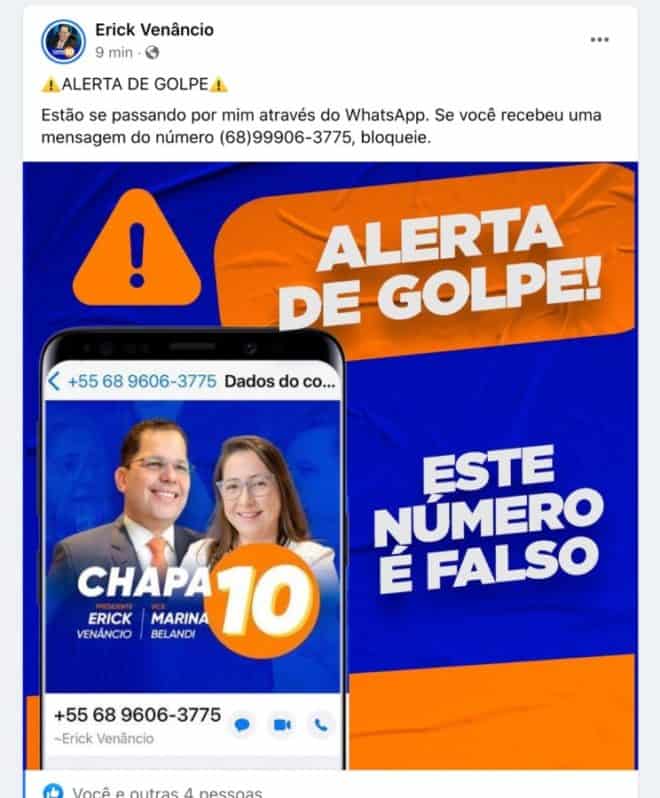 Por meio das redes sociais, o advogado alertou sobre o crime. “Estão se passando por mim através do WhatsApp. Se você recebeu uma mensagem do número (68) 99906-3775, bloqueie”, pediu.