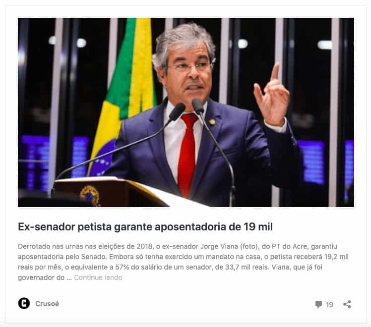 Derrotado nas eleições de 2018, o ex-senador Jorge Viana, do PT do Acre, garantiu uma aposentadoria de R$ 19,2 mil por mês, informa Igor Gadelha na Crusoé.