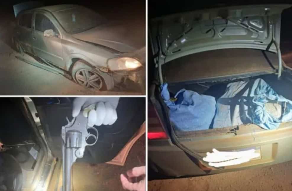 Após 20 minutos de acompanhamento tático, os agentes localizaram o automóvel abandonado no trevo de acesso à BR-364. Dentro do porta-malas, foram encontrados 70 tabletes da substância análoga à maconha, um revólver não identificado (sem marca ou numeração) e um rádio comunicador. Não havia munição com a arma.