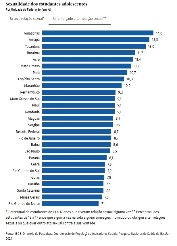 Quando se trata de adolescentes que já foram forçados a ter relação sexual, a pesquisa aponta que o Acre ocupa o 5º lugar, com 11,4% . O percentual inclui estudantes de 13 a 17 anos que alguma vez na vida alguém ameaçou, intimidou ou obrigou a ter relações sexuais ou qualquer outro ato sexual contra a sua vontade.