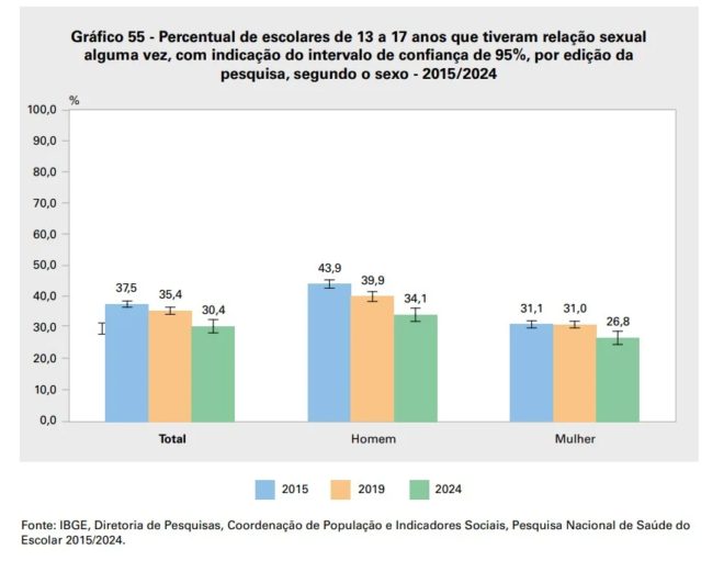 Em todo o Brasil, os adolescentes homens iniciam a vida sexual antes das mulheres. Segundo os dados do IBGE de 2024, 34,1% dos homens afirmam que tiveram relação sexual alguma vez, enquanto entre as mulheres o percentual é de 26,8% . Os números referem-se a adolescentes de 13 a 17 anos .