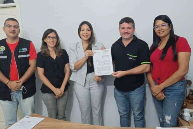 Termo de cooperação técnica para implantação do Procon em Epitaciolândia foi assinado pela presidente do órgão, Alana Albuquerque, e o prefeito Sérgio Lopes, nesta quinta-feira, 23. Foto: Cedida