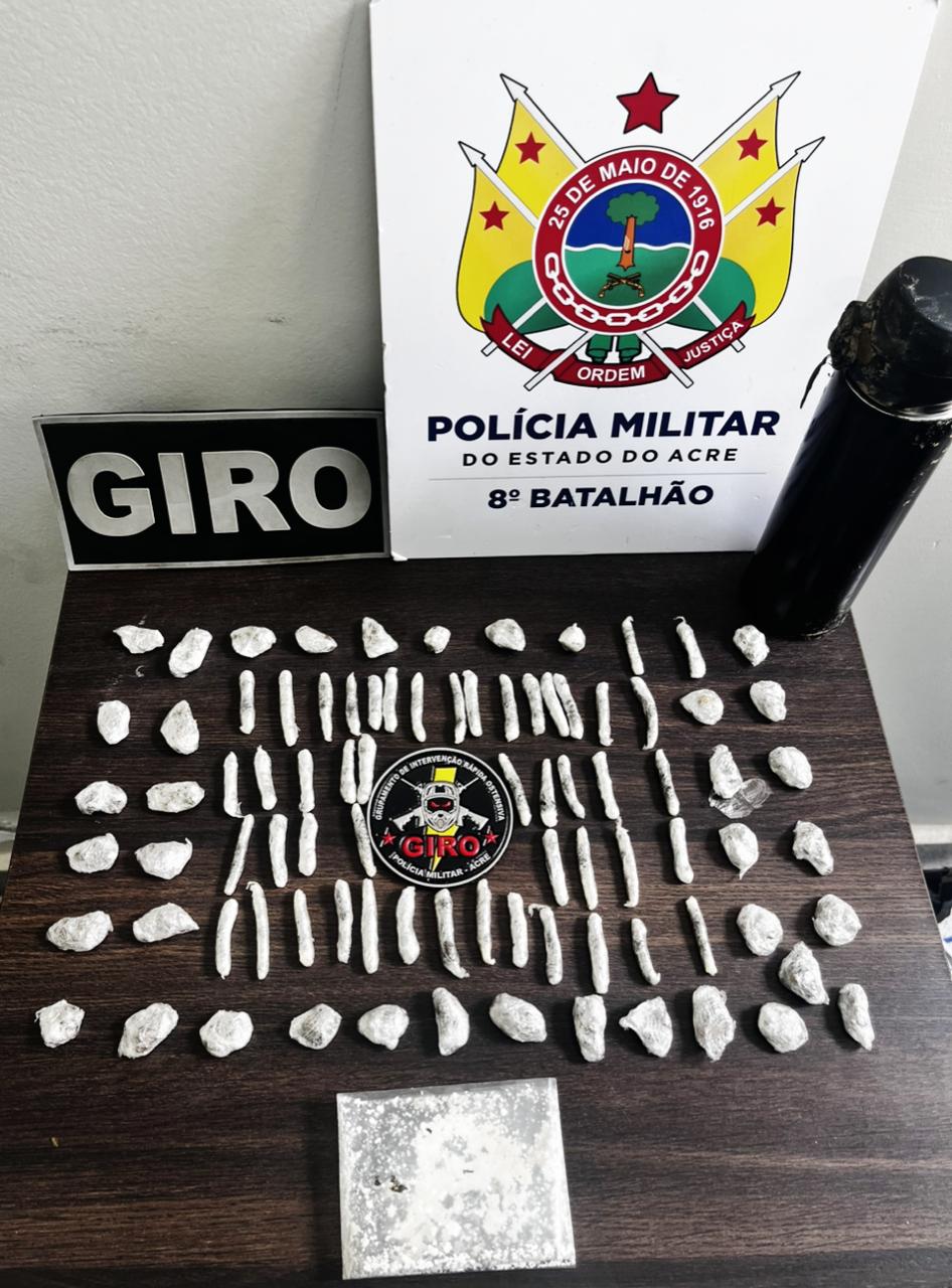 Durante patrulhamento na área, conhecida pela atuação de uma facção criminosa e pelo comércio de drogas, a guarnição avistou o suspeito em frente ao imóvel. Assim que percebeu a presença policial, ele demonstrou nervosismo e correu para dentro da casa. Na aproximação, os militares viram um objeto sendo arremessado pela janela. Tratava-se de uma garrafa térmica com 86 tabletes de maconha.