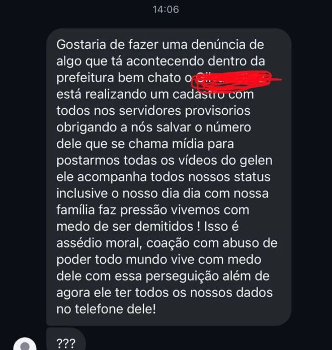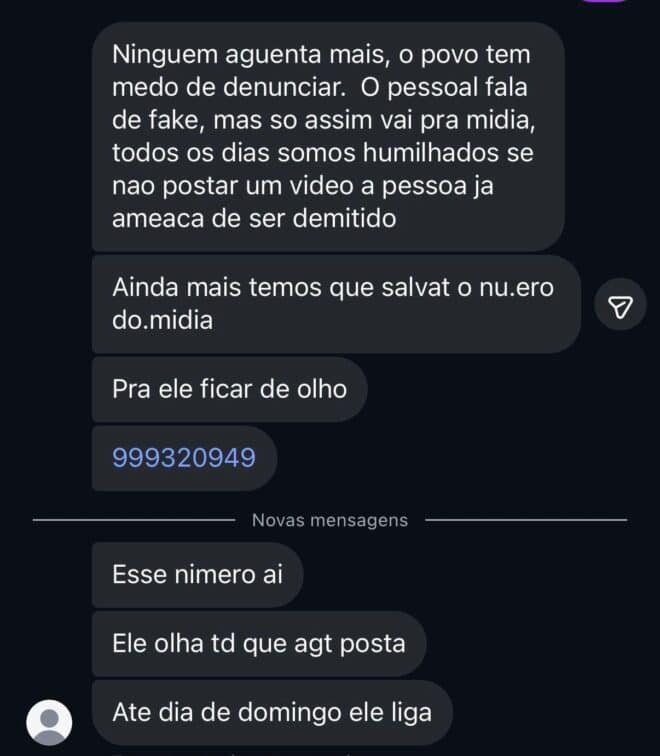 “Temos que postar todos os vídeos do prefeito, acompanha todos os nossos status, inclusive faz pressão no dia-dia com nossa família, vivemos em um medo constante de sermos demitidos. Ninguém aguenta mais, o povo tem que denunciar, pois só assim vai pra mídia, somos humilhados, se não postar o vídeo, a pessoa já ameaça de nos demitir”, disse o servidor que pediu para não ser identificado.