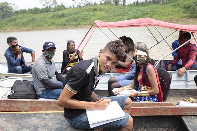 Em tempo de pandemia, a luta contra o coronavírus também é dos professores que compõem a rede pública de ensino rural da Secretaria de Estado de Educação e Cultura e Esportes (SEE), que, para atrair a atenção da meninada, não pensaram duas vezes em se vestir de heróis das revista em quadrinhos, e dos desenhos animados, para levar atividades escolares aos alunos das escolas rurais Santa Fé e Nossa Senhora Auxiliadora, a mais de duas horas de barco desde Porto Acre.