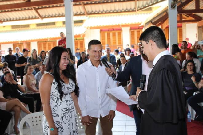 Um dos momentos mais emocionantes, o tradicional casamento coletivo oficializou a união de 35 casais, em cerimônia muito prestigiada por parentes e amigos das noivas e noivos. Além do dispositivo de honra, que foi composto pelo juiz de Direito e celebrante da cerimônia de casamento civil Alex Oivane, o prefeito de Epitaciolândia Sérgio Lopes, o coordenador do MP na Comunidade, promotor Dayan Albuquerque, representando o Ministério Público do Estado, promotor de Justiça Juleandro Martins, pela Ordem dos Advogados do Brasil, seccional Acre (OAB-AC), advogado Gabriel Rossi, representando a Defensoria Pública do Estado, a defensora Pública Ariela Andrade e a delegatária do Cartório de Epitaciolândia Valéria Aquino.