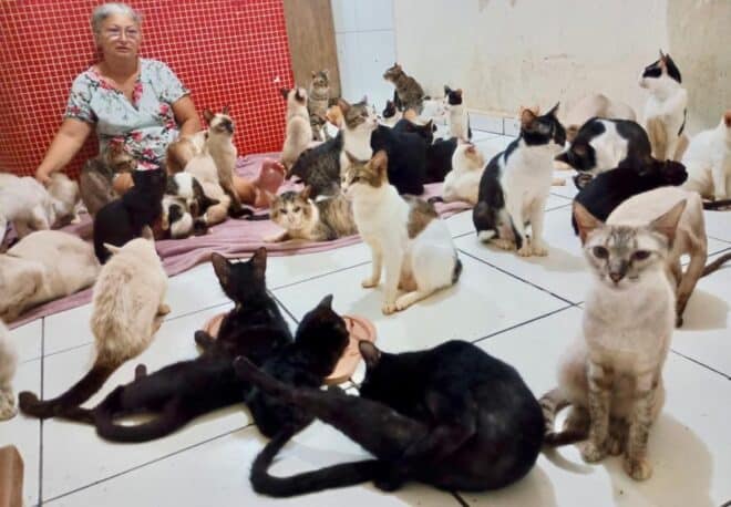 Em meio a uma rotina exaustiva, a protetora independente de animais Francisca Martins, de 51 anos, cuida atualmente de 128 gatos resgatados de situações de abandono, maus-tratos e doenças em Rio Branco. A maioria dos felinos é idosa e tem problemas de saúde crônicos, o que dificulta a adoção e aumenta os custos com alimentação especial, medicamentos e consultas veterinárias.