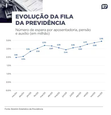 O volume passou de 1,98 milhão, no mesmo período de 2024, para 2,97 milhões de requerimentos aguardando aposentadoria, pensão ou auxílio. O que representa um aumento de 49%.