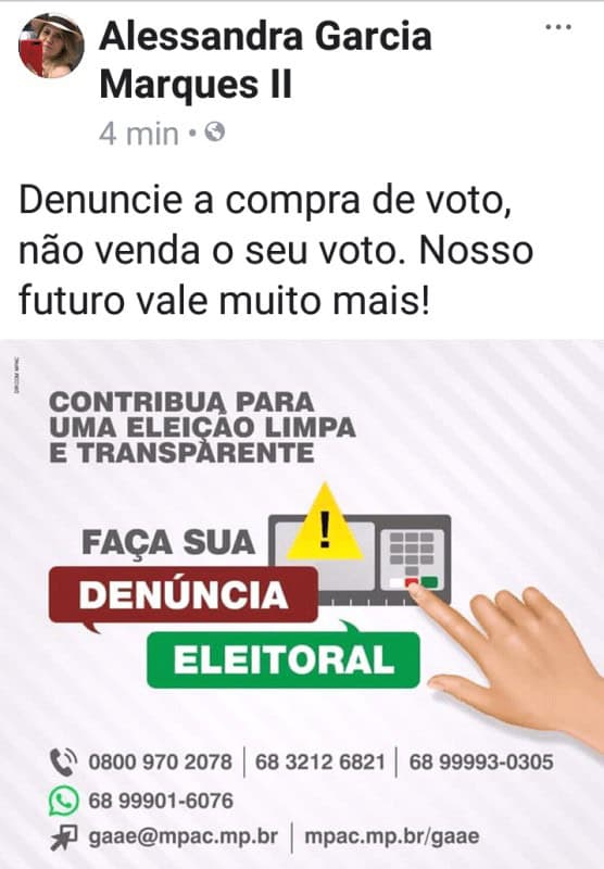 Além dos portais do Ministério Público Eleitoral (MPE) e números para denunciar já existentes para que qualquer cidadão ou eleitor que verificar, ou souber de de práticas ilícitas nas eleições, a Promotora responsável pela lisura do processo no Acre, Alessandra Marques, vem usando a sua própria conta pessoal do facebook, para disseminar a informação da importância da licitude do pleito.