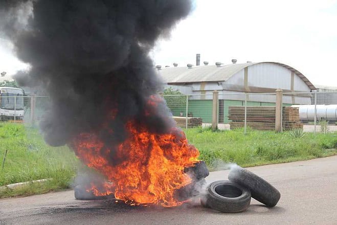 Funcionários queimaram pneus em frente ao portão de acesso em protesto pelo atraso de pagamentos – Fotos: Alexandre Lima