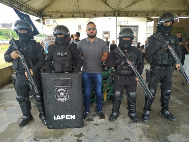 Presidente do Iapen, Lucas Gomes com os policiais penais equipados com o novos materiais de segurança Foto: Ascom.