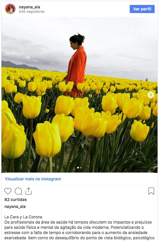 No texto, ela observa como a chegada da pandemia do coronavírus desacelerou o mundo em que vivemos. Nayana traz uma ótica um pouco mais otimista no enfrentamento da doença.