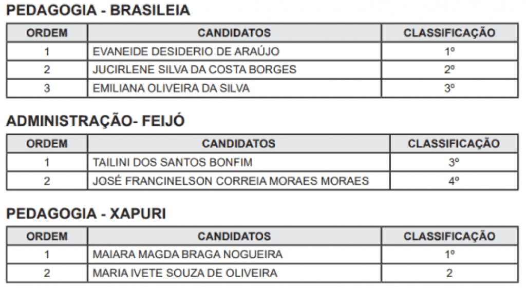 Foram chamados sete candidatas e candidatos, nas áreas de Administração e Pedagogia para as comarcas de Brasiléia, Feijó e Xapuri. Confira a lista:
