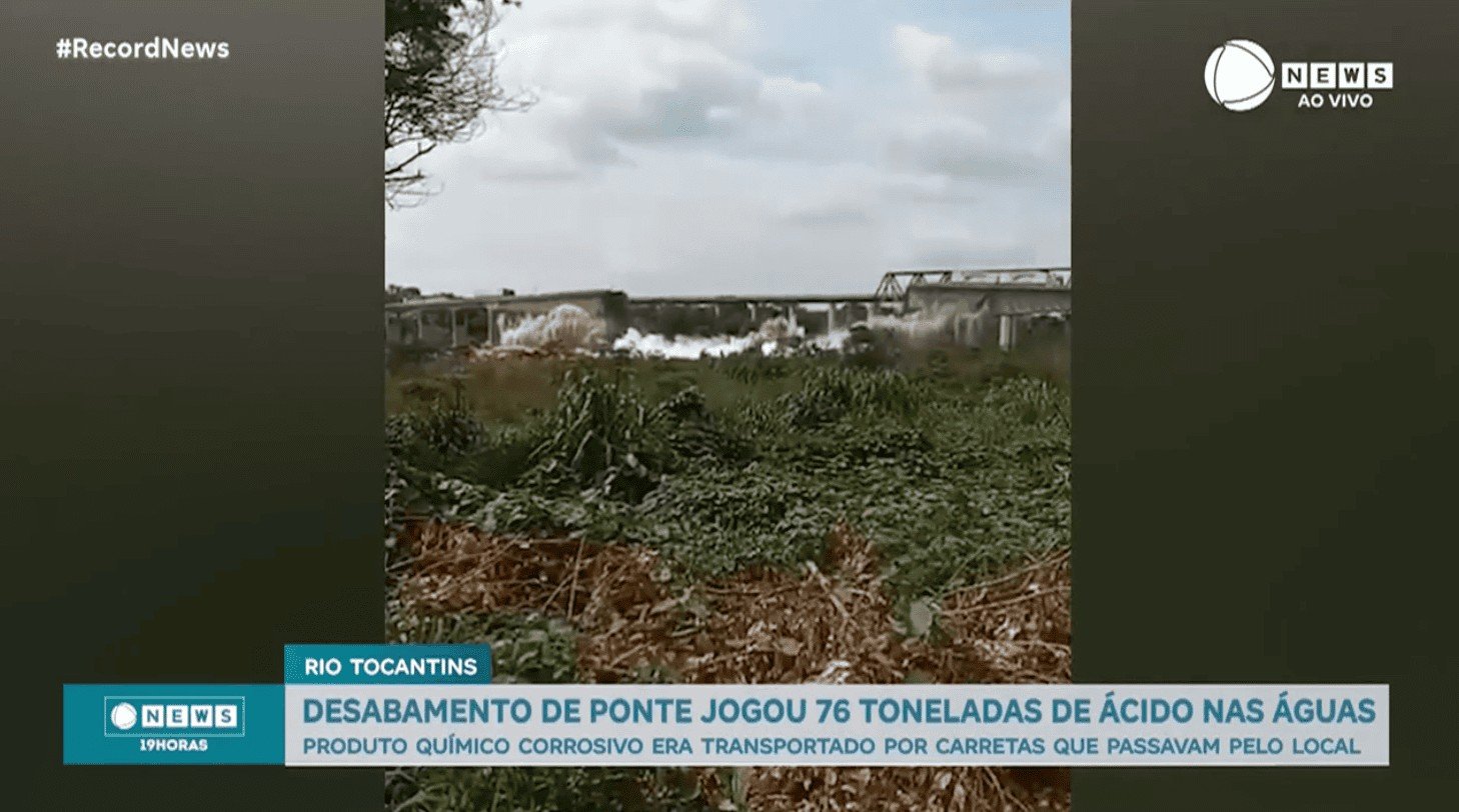 Dois caminhões que caíram nas águas do rio Tocantins após o desabamento da ponte, no domingo (22), estavam carregados com 76 toneladas de ácido sulfúrico e mais de 20 mil litros de herbicidas. Em entrevista ao News das 19h desta terça-feira (24), Viviane Brandão, superintendente da ANA (Agência Nacional de Águas), comenta que, “caso haja vazamento da carga, é discreto”. O monitoramento da água, feito com uma sonda multiparamétrica, não encontrou alterações no pH ou na temperatura. “O ácido é muito forte e teria que ter elevado pelo menos um dos parâmetros”, afirma.