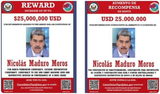 Esse valor foi aumentado para US$25 milhões em janeiro de 2025, durante governo Biden, como retaliação à posse de Maduro para um novo mandato como presidente.