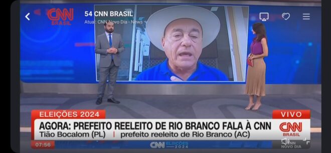 O prefeito de Rio Branco, reeleito no primeiro turno com 108.605 votos, o que representa 54,82% dos votos válidos, Tião Bocalom foi convidado a participar, nesta segunda-feira (8), por meio de videoconferência, do programa CNN Novo Dia.