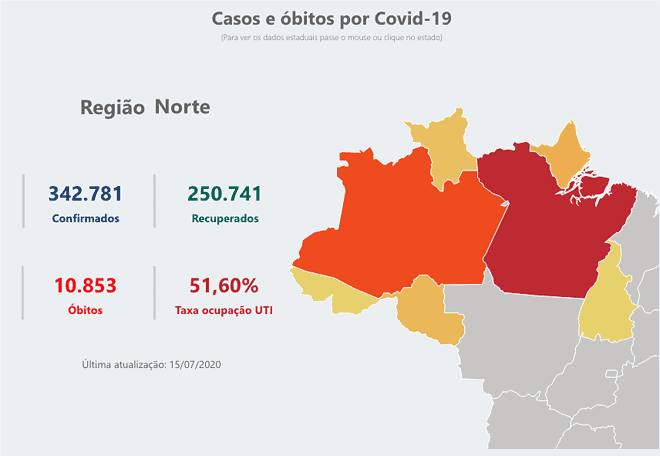 Na região Norte, o Pará é o estado com mais casos confirmados do novo coronavírus. São 135.164. Ao todo, 5.448 óbitos foram registrados, de acordo com as autoridades de saúde locais. O governo do estado foi um dos primeiros a adotar o bloqueio total (lockdown) no país. Em meados de maio, Belém e mais 15 cidades enfrentaram restrições severas de circulação.
