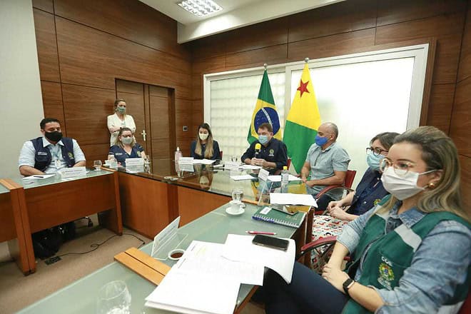 Coletiva de imprensa anunciou a nova classificação de nível do estado em relação ao que foi proposto no Pacto Acre sem Covid Foto: Marcos Vicentti/Secom.