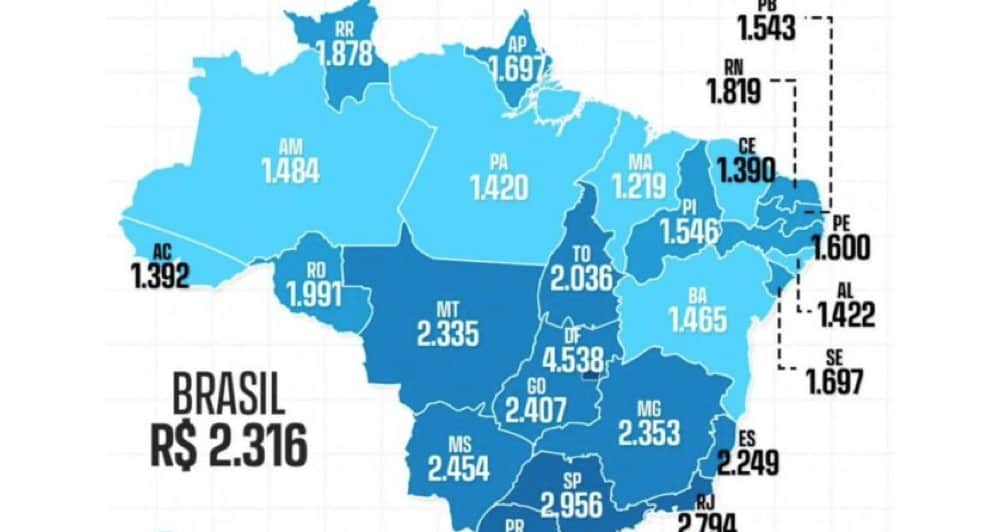 Média nacional ficou em R$ 2.316; Acre supera apenas Maranhão (R$ 1.219) e Ceará (R$ 1.390) no ranking das 27 unidades da federação