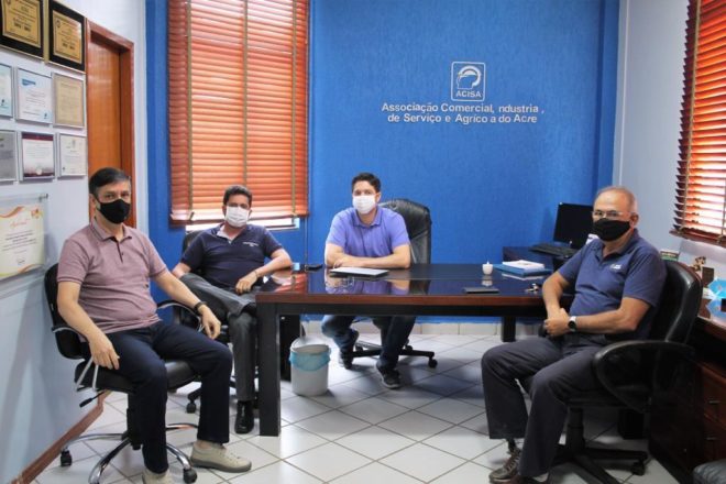 Representares da Associação Comercial (Acisa), da Federação das Indústrias (Fieac), Federação do Comércio (Fecomércio), Federação das Associações Comerciais (Federacre) e do Sebrae, se reuniram na manhã de hoje, 30, com membros da governo do Estado e do Comitê Especial de Acompanhamento da Covid.