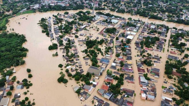 Vista de Brasiléia alagada nesta segunda-feira, dia 26 – Foto: Vinicius Ferrari/cedida – PROATEC- Projetos e Assessoria técnica rural
