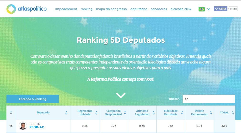 A ferramenta online Atlas Político divulgou ranking com a atuação parlamentar dos políticos brasileiros, pontuando critérios como Representatividade, Campanha Responsável, Ativismo Legislativo, Debate Parlamentar e Fidelidade Partidária.